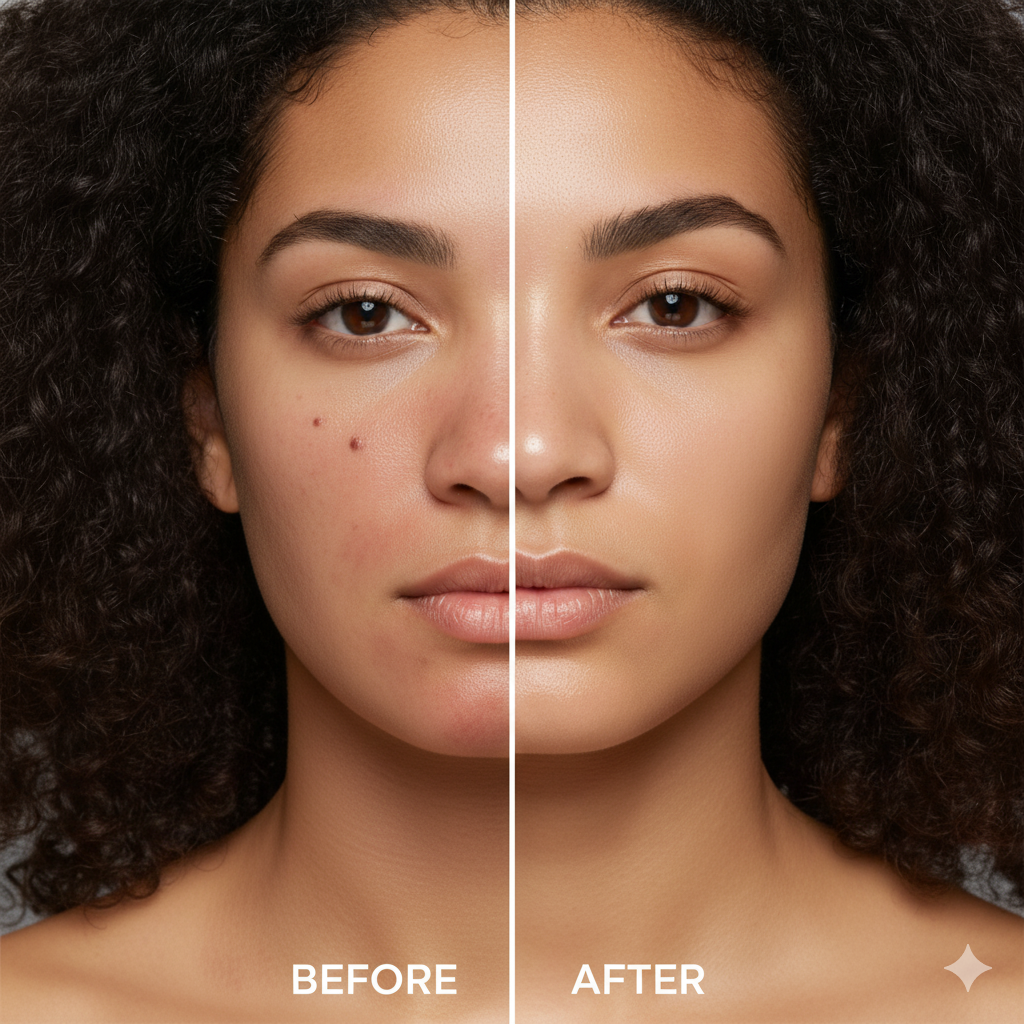 Clinical data and microscopic imagery show visibly brighter tone, refined pores, and smoother skin texture starting night one.