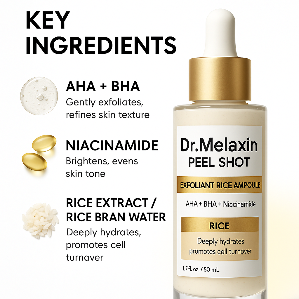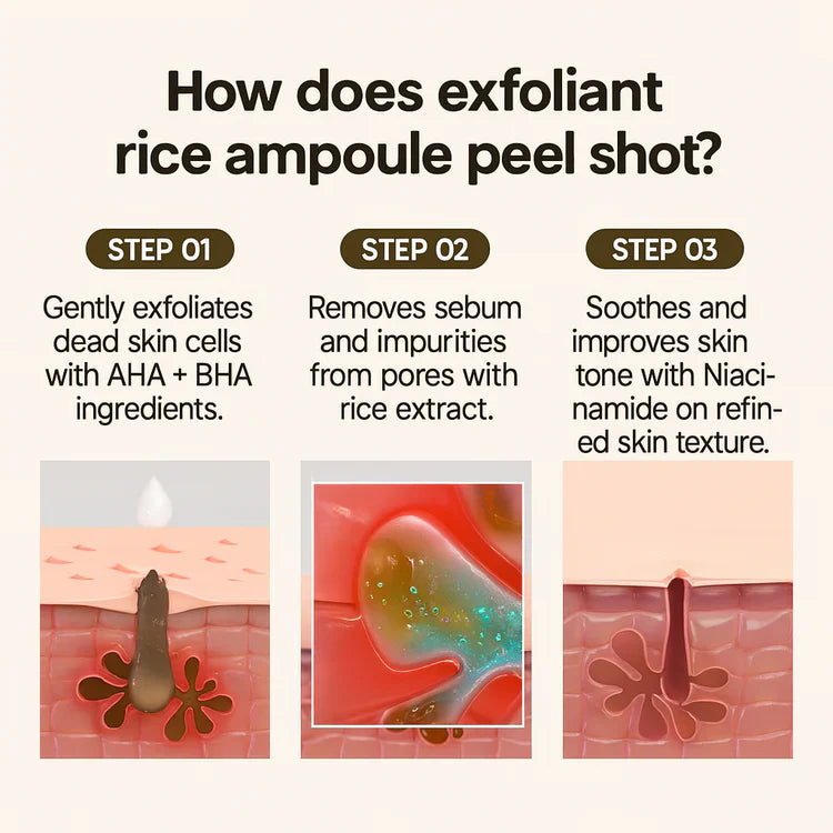 A lightweight essence ampoule that gently exfoliates, deeply hydrates, and brightens for smoother, radiant skin. Powered by AHA, BHA, PHA, Niacinamide, and Rice Bran Water — suitable for all skin types.
